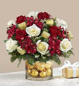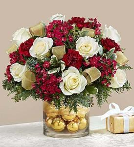 Celebrate the glory of the season with an arrangement that wows! Artistically hand-designed in shades of warm, rich burgundy & white, this eye-catching bouquet is gathered into an elegant glass vase filled with shimmering golden ornaments to fill their home (or yours) with holiday spirit and style