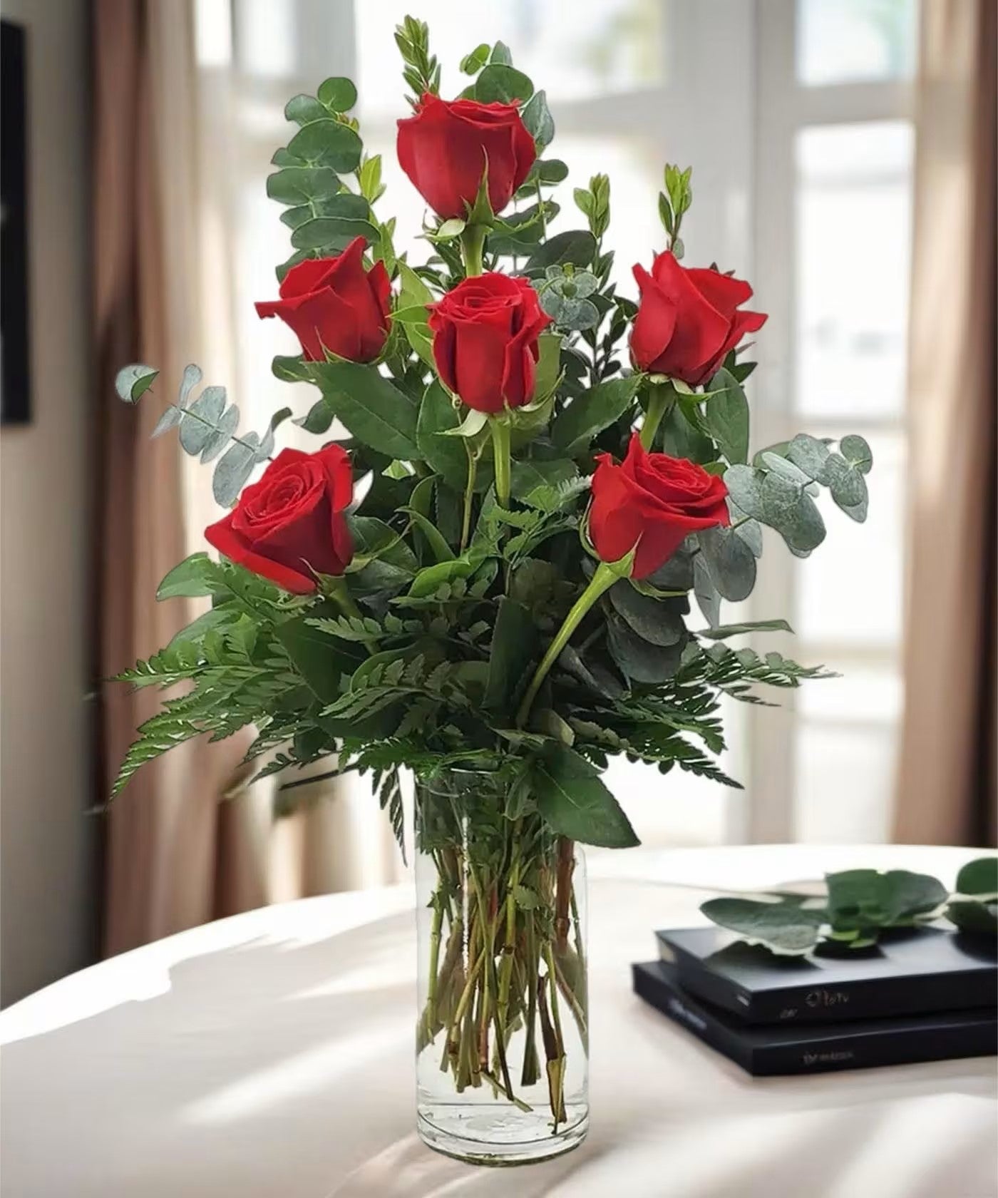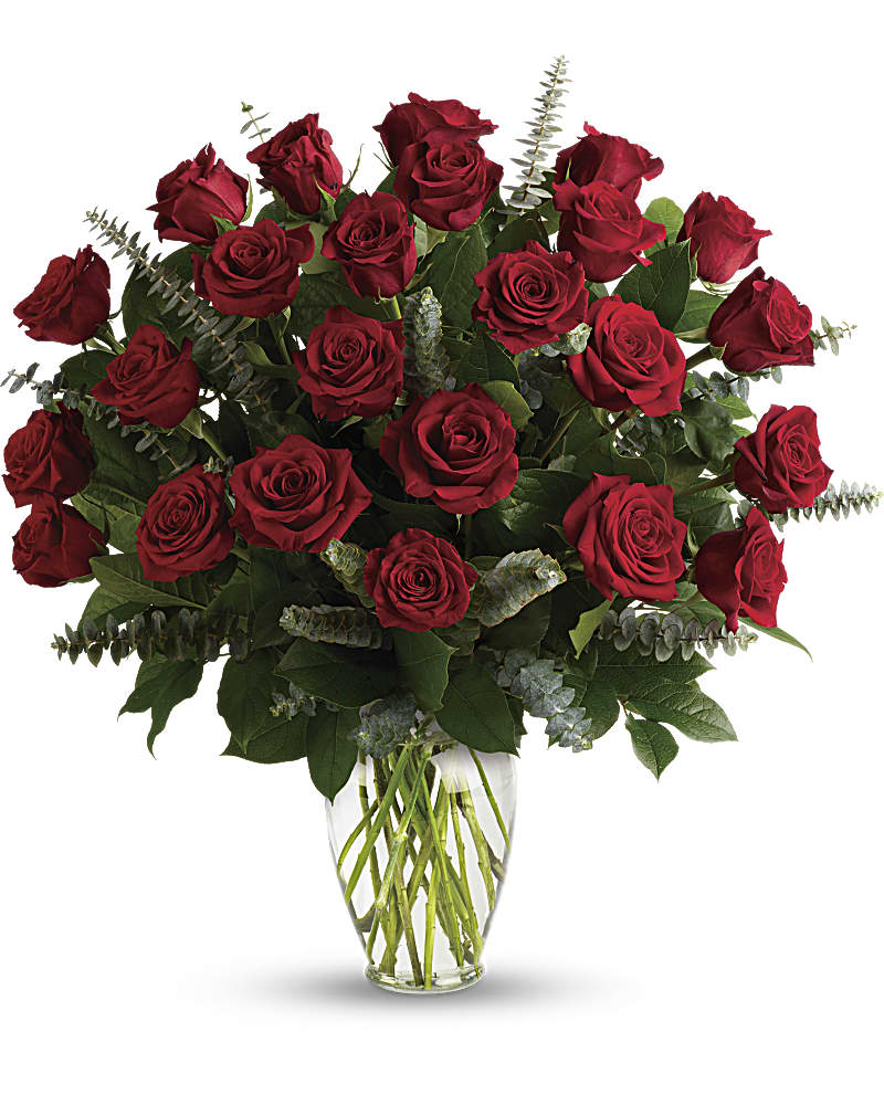 Gorgeous red roses are displayed in a lush array of fern, eucalyptus, pittosporum and ruskus foliages.