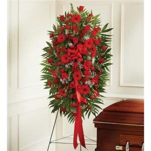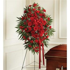 This Sympathy Standing Spray, in beautiful red, is a touching symbol of your sympathy and support. . Red flowers such as roses, Gerbera daisies, spray roses, carnations and more. An appropriate gift for family, friends and business associates to send directly to the funeral home. Our florists use only the freshest flowers available, so colors and varieties may vary Large measures approximately 46"H x 42"L Medium (shown) measures approximately 46"H x 38"L Small measures approximately 42"H x 30"L