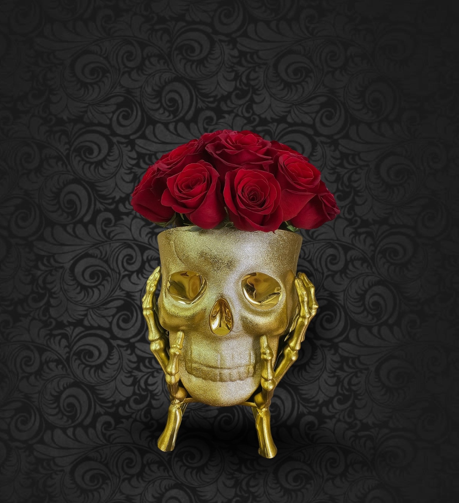 A bouquet for the bold and the bewitched. Deep red roses fill a keepsake skull candy bowl, symbolizing a love that transcends life and lingers in the shadows. Perfect for gothic romantics & Halloween souls as a dark & chic centerpiece. Crafted for those who adore mystery, obsession, and a little bit of darkness.