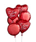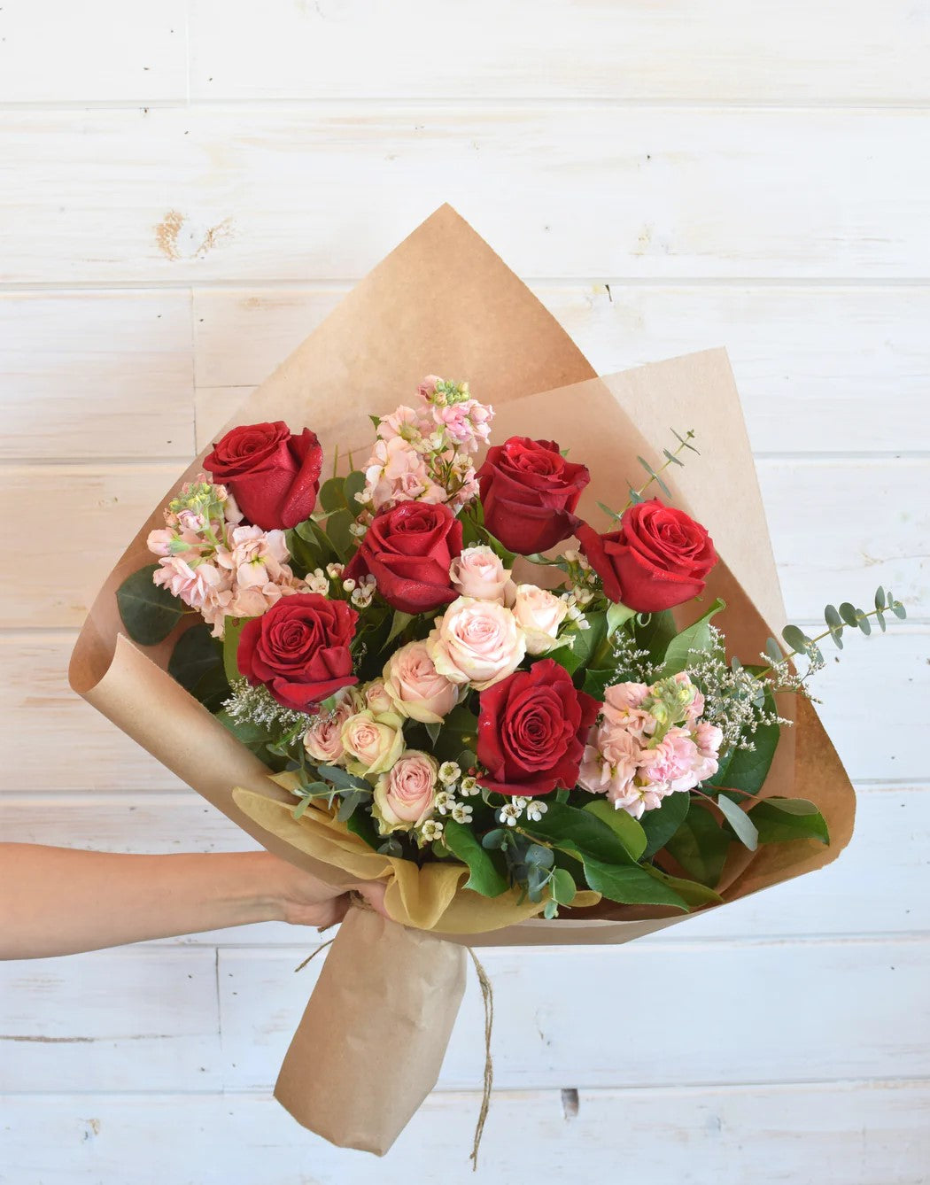6 red roses are presented with 3 stems of spray roses and 3 pastel toned stock flower, wrapped in kraft paper with seasonal greens. Bloom tone variety will vary with season.