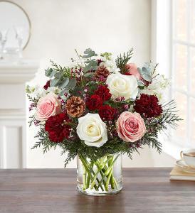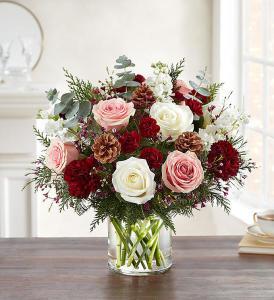 Celebrating the grandeur of Victorian floral design, our lavish winter bouquet makes one grand display. A lush gathering of rich red, soft pink and creamy white blooms brings warmth and radiance. Rustic pine cones play up its natural beauty. For big celebrations or small-but-significant moments, this enchanting arrangement leaves a lasting impression.