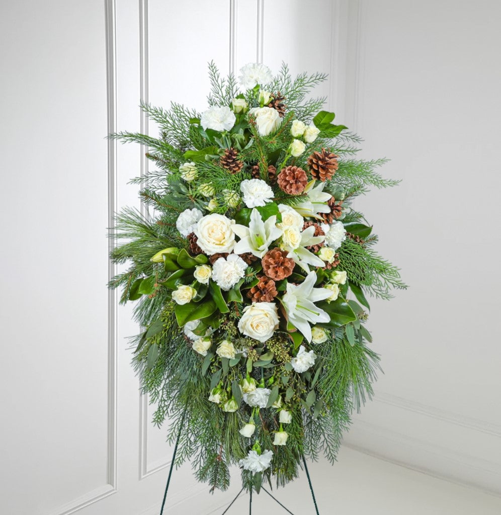 This serene design features an elegant blend of seasonal white blooms—artfully arranged among lush winter evergreens, with natural pinecone accents to bring a touch of warmth to the cool winter palette. Thoughtfully crafted for funerals and memorial services, this standing spray evokes the quiet beauty of a winter morning. Winter Whispers offers a gentle, comforting tribute that honors their memory with simplicity, elegance, and the peaceful spirit of the season.